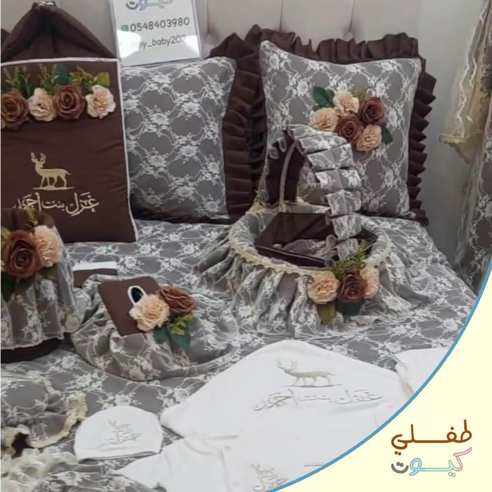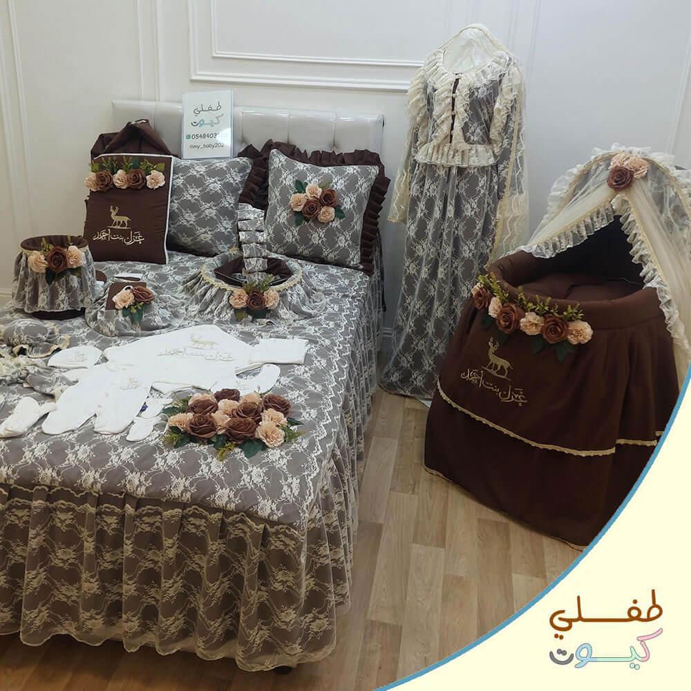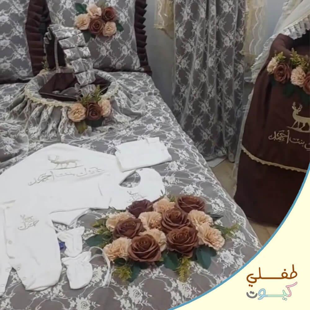استقبلي مولودكِ بأناقة لا مثيل لها مع طقم الاستقبال الفاخر المصمم خصيصًا ليحمل اسم صغيركِ الغالي. تصميم ملكي بلون بني أنيق ومطرز بتطريز ذهبي راقٍ، مع لمسات من الدانتيل الفاخر والورود الهادئة التي تضيف سحرًا فخمًا لكل قطعة.